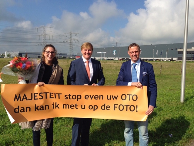 De koning was woensdag op bezoek in Zwolle om het nieuwe bedrijfspand van Wehkamp te openen. Van Buul en Keizer stelden zich strategisch op op het bedrijventerrein Hessenpoort in de wetenschap dat de koninklijke limousine daar voorbij zou komen. Tot hun verrassing stopte de auto inderdaad en Willem Alexander stapte uit om samen met het duo en het spandoek op de foto te gaan.